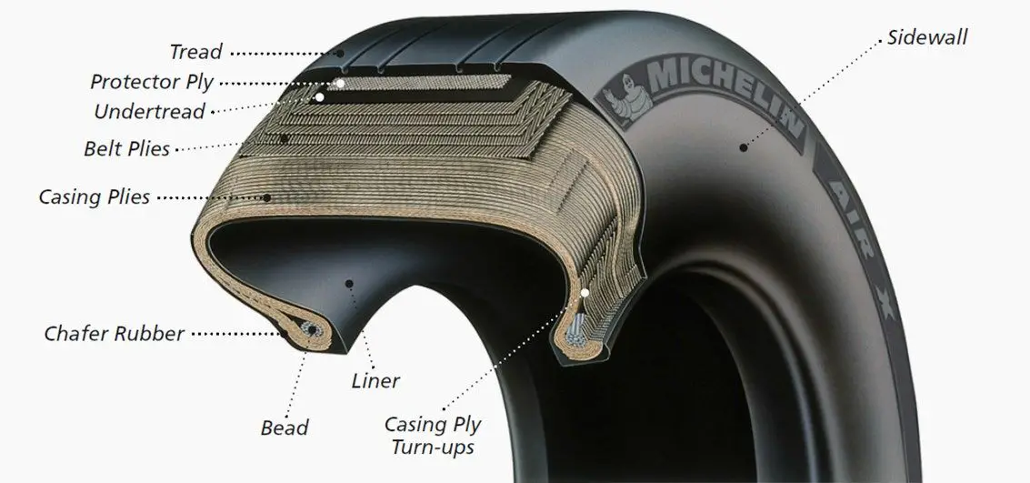 - Capas de la carcasa: capas alternas de tela recubierta de caucho (que se extienden en ángulos opuestos entre sí) proporcionan la resistencia del neumático.