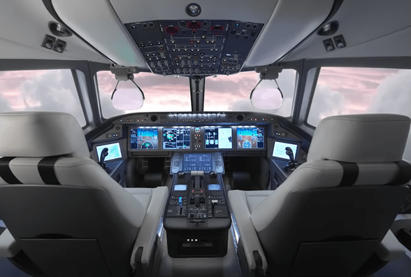 La cabina de pilotaje, desarrollada en conjunto entre la empresa rusa Avionika y la americana Rockwell-Collins la hacen una cabina muy moderna y avanzada, comparable a la de sus similares Airbus y Boeing. Con 5 pantallas de cristal líquido y dos pantallas laterales a manera de “Electronic Flight Bag” para los pilotos, algunos componentes de aviónica, son suministrados por Honeywell y Thales Aerosystems. Adicionalmente se pueden instalar también visores HUD. Este será el primer avión ruso cuyo mando se realizará mediante Sidesticks laterales como en los Airbus.