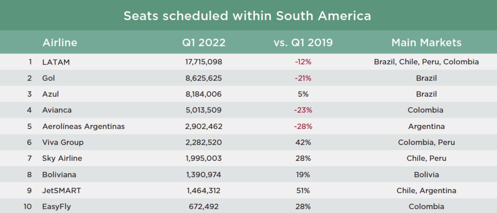 Con una asistencia gubernamental mínima, las aerolíneas de Sur América enfrentaron la angustia de la era de la pandemia, posiblemente incluso más grave que en otras regiones con la capacidad altamente afectada. LATAM, un poderoso competidor internacional durante décadas y, con mucho, la aerolínea más grande del continente, se vio obligada a ingresar al Capítulo 11. Lo mismo para Avianca, que (como puede ver a continuación) redujo la capacidad dentro de América del Sur en casi el doble de la tasa de LATAM. La brasilera GOL, que estuvo cerca de declararse en quiebra, se contrajo en un porcentaje similar al de Avianca.
