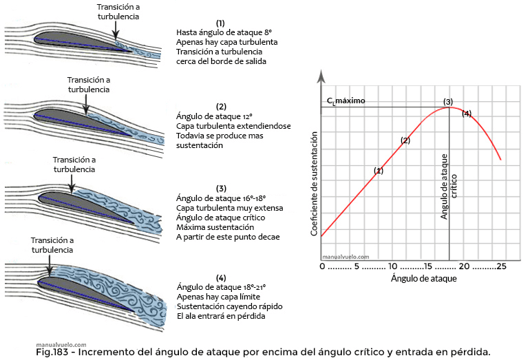Sin embargo, se sigue usando la expresión velocidad de perdida. Miremos la fórmula (S=Cs*a*p/2*V´´) de nuevo para un peso dado, con un área constante, una misma altura, veremos que para tener una velocidad mínima necesitamos un CL máximo, y ese se consigue con un ángulo de ataque determinado (para un perfil en particular); Entonces, si hay una relación de velocidad y la perdida, pero realmente lo que pasa es que si la velocidad disminuye por debajo de esa valor y el piloto quiere mantener la altura, instintivamente va a levantar la nariz sin darse cuenta de que al hacerlo va a complicar la maniobra, porque va a pasar todo lo que él quería evitar y con consecuencias muchas veces desastrosas si no tienes la altura necesaria para recuperarse. Pero esto (de usar una velocidad de perdida) tiene sus ventajas, el velocímetro es el instrumento que más vigila un piloto por ser el más importante en el vuelo del avión, algunas aeronaves tienen también indicador de ángulo de ataque, pero la mayoría tiene más bien alarmas para que el piloto sepa que está excediendo (o próximo a exceder) ese valor. Otros aviones van aún más allá y le imprimen una fuerza hacia adelante a la columna del elevador (para bajar el ángulo de ataque). Podemos ver que en estos equipos no tiene relación con la velocidad ni con el peso del avión y solo está conectado a un sensor de A.O.M. que se activa algunos grados antes de que llegue al punto crítico y así alerta al piloto unos nudos antes de que sea efectiva esa pérdida de sustentación.
