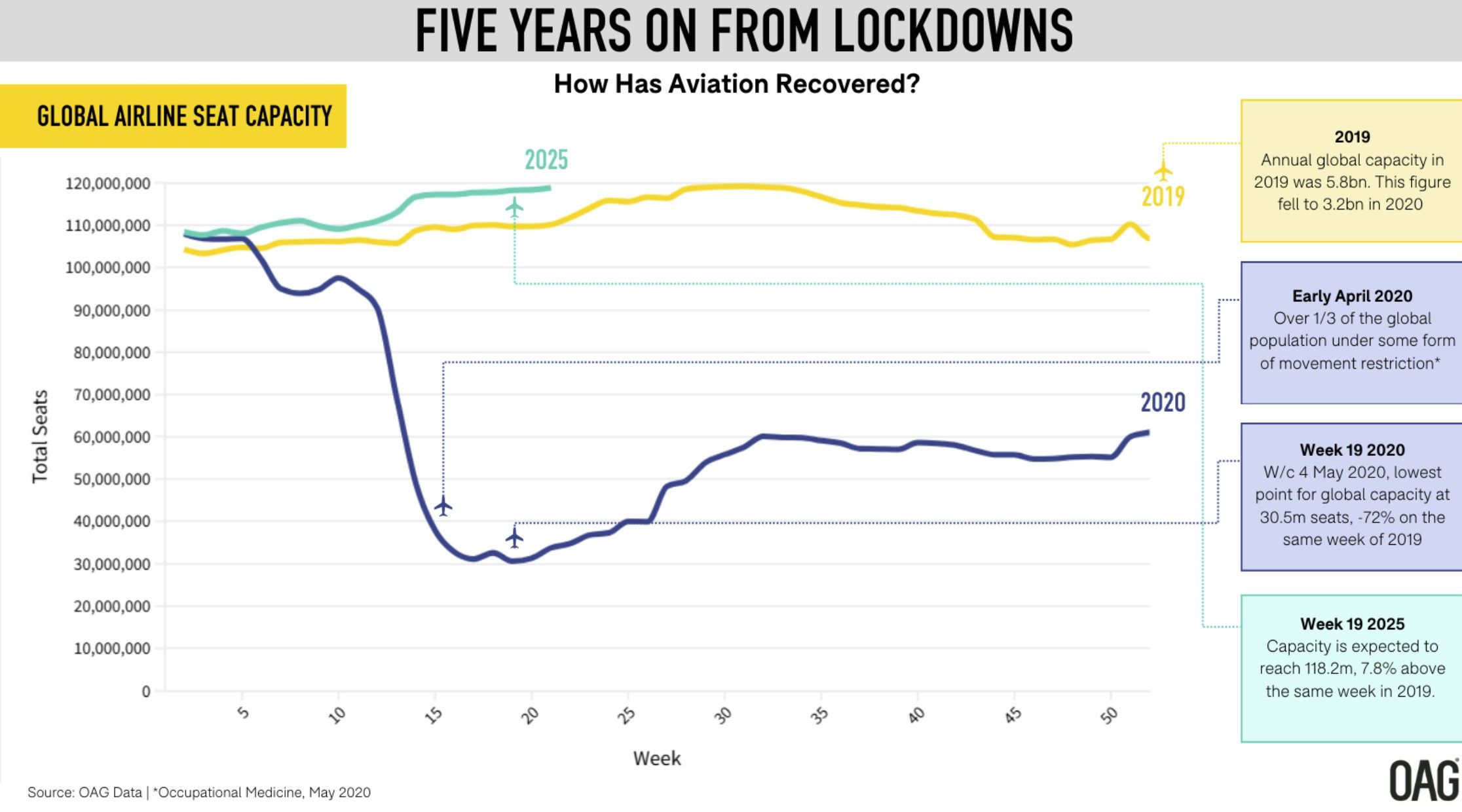 Cinco años después de que los confinamientos por COVID-19 paralizaran el mundo, el sector de la aviación global ha experimentado una transformación dramática. Los datos de OAG, un proveedor líder de información de viajes aéreos, nos permiten visualizar la magnitud del impacto y la notable recuperación que ha seguido.