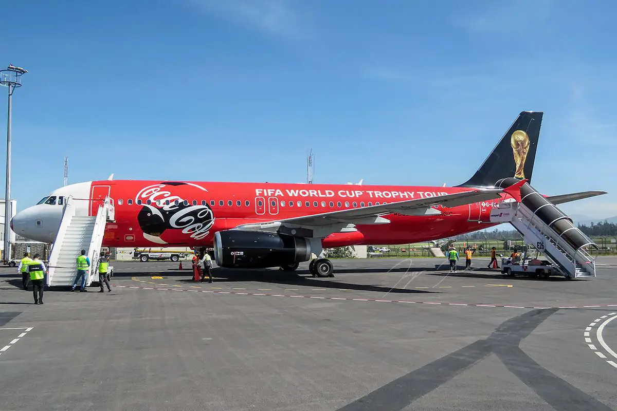 Der WM-Pokal Katar 2022 gelandetó an Quito im Airbus A320 aus Coca Cola auf seiner Welttournee, Wir erzählen Ihnen Einzelheiten zu diesem Ereignis.