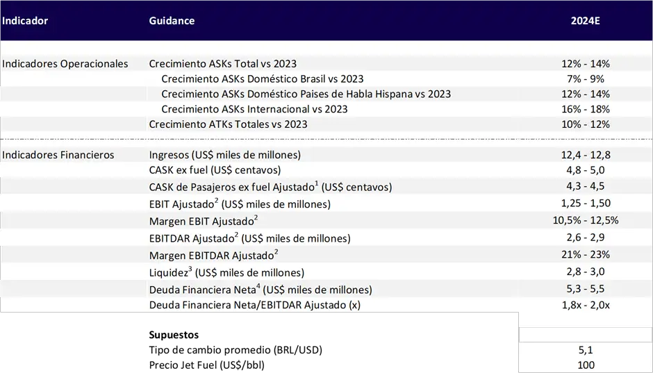 Und TéFinanzielle Bedingungen, el grupo proyecta un EBITDAR ajustado réSchnur für 2024 entre US$2.600 millones y US$2.900 millones. Esto representa una reducción de su endeudamiento aproximada del 50% versus los niveles de apalancamiento posterior a la exitosa salida del proceso de reestructuración de CapíLeckage 11.