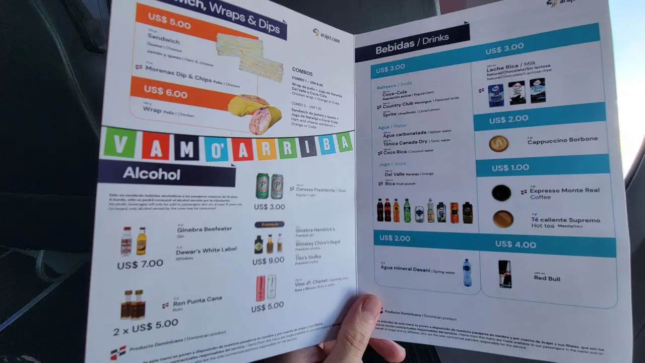 As you have seen in the different flight reports, the airínea does not offer included in any rate the free food service that an airlineítraditional line will be able toíto carry out, but calm, you won't dieás of hunger. Arajet on its flights has a menuú of food for payment called Comida pa´ chop, in which from $2 dólares onwards findás café, té, snacks hasta sándwiches.