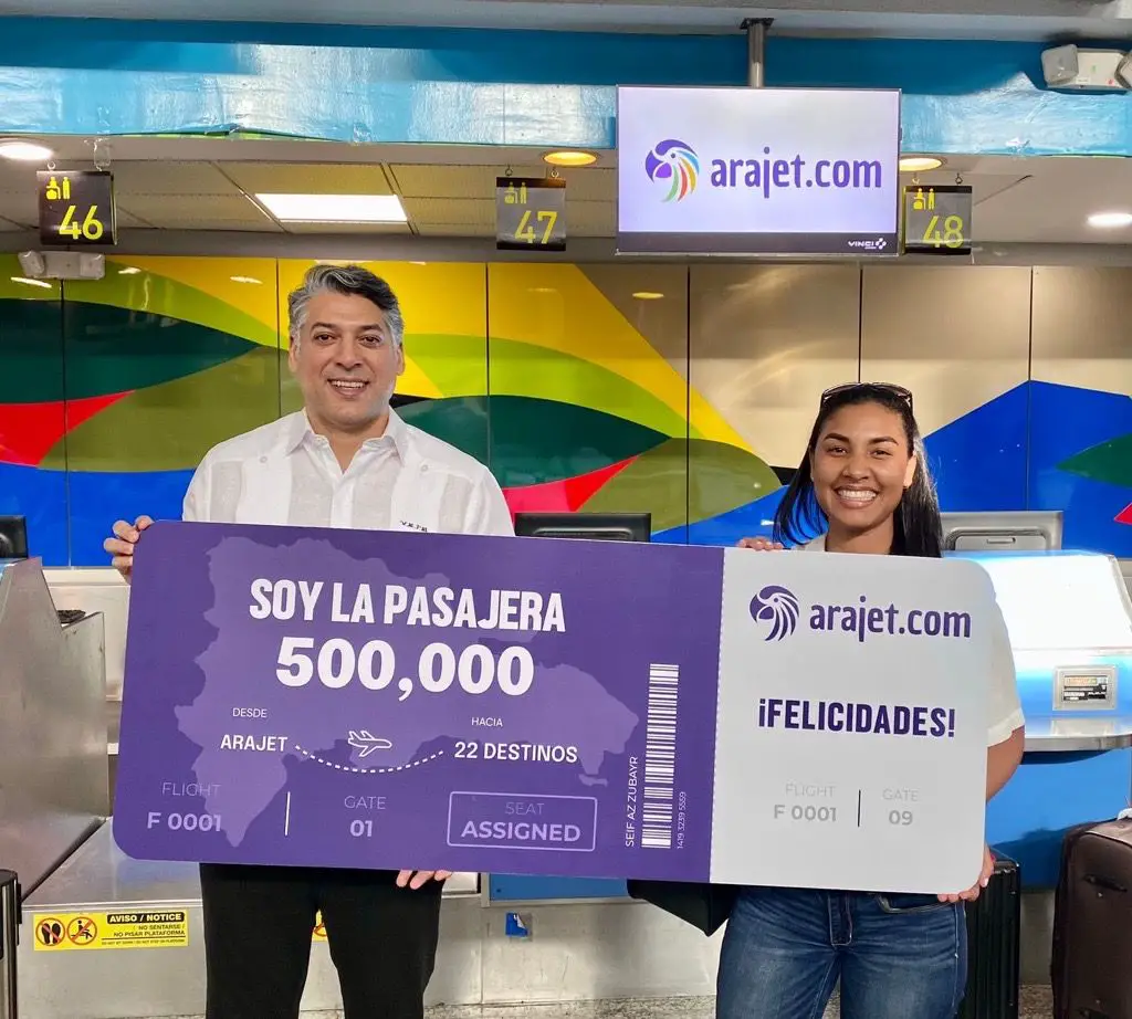 the airínea informó that Carolyn Rijo, who boardedó a flight of Santo Domingo a Averageín, was the passengerúmero 500 thousand and receivedó as a gift a ticket toéprisoner for two people who caná use to travel to any of the 22 destinations in 15 paíyou are the ones who fly Arajet.