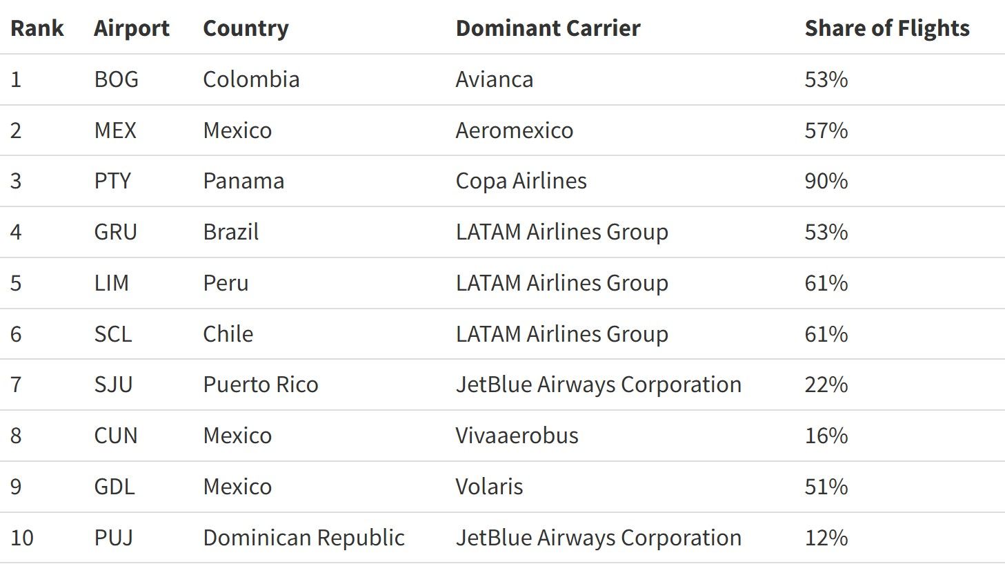 El análisis de los Megahubs de Latin America revela patrones claros en la conectividad aérea de la región. El ranking está liderado por Bogotá (BOG) en Colombia y Ciudad de México (MEX), destacando el papel central de sus aerolíneas de bandera, Avianca (53%) and Aeromexico (57%), respectively. Nevertheless, el caso más notorio de concentración se da en Panama (PTY), where Copa Airlines operates an overwhelming 90% of the flights. Esta cuota excepcionalmente alta subraya a PTY como el megahub más fuertemente centralizado, funcionando esencialmente como el principal punto de transferencia de la región para la red de Copa.