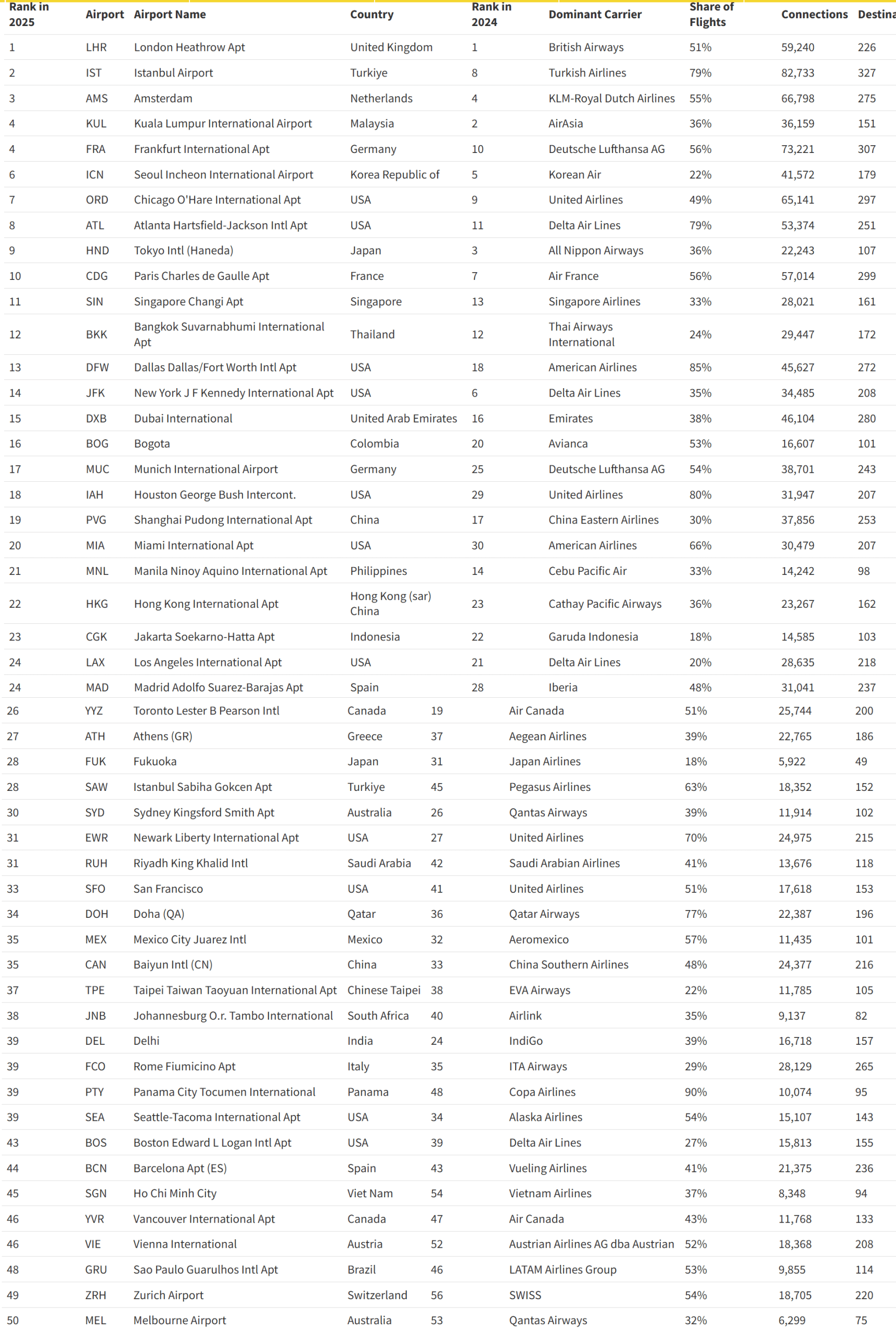 In EE. UU., Chicago O’Hare (WORDS) It is the main international center, while JFK falls from sixth to fourteenth place in 2025. Atlanta Hartsfield-Jackson (ATL) follows closely behind ORD in eighth place. Three Middle Eastern airports are among the 50 main worldwide: Dubai International (DXB) ocupa el puesto más alto, at 15, y también se incluyen Riad (RUH) y Doha (DOH). SPIRIT sube 11 year-on-year positions, surpassing at DOH.
