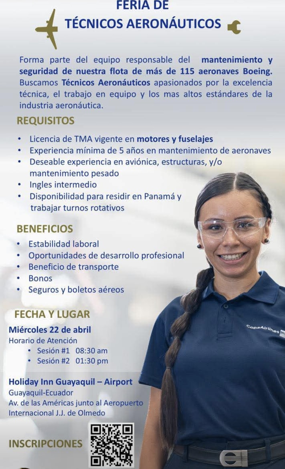 Aeronautical technical fairFor Nicolas Larenas / april 16, 2026 Full Time Guayaquil Posted ago 3 days Copa Airlines Please, To apply for this job visit forms.office.com. Share: Share on WhatsApp (Opens in a new window) WhatsApp Share on Telegram (Opens in a new window) Telegram Compartir en Reddit (Opens in a new window) Reddit Share on Tumblr (Opens in a new window) Tumblr Share on Facebook (Opens in a new window) Facebook Share on LinkedIn (Opens in a new window) LinkedIn Click on Pinterest (Opens in a new window) Pinterest Share on X (Opens in a new window) X