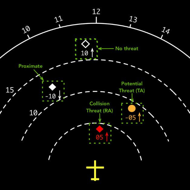 Alertes TA (avis de circulation) avertir du trafic potentiellement à proximité dont il faut se méfier au cas où vous deviez manœuvrer l'avion pour éviter une collision. Le Système s'allume sur son écran indiquant la position relative et un signal sonore « Trafic, Trafic"