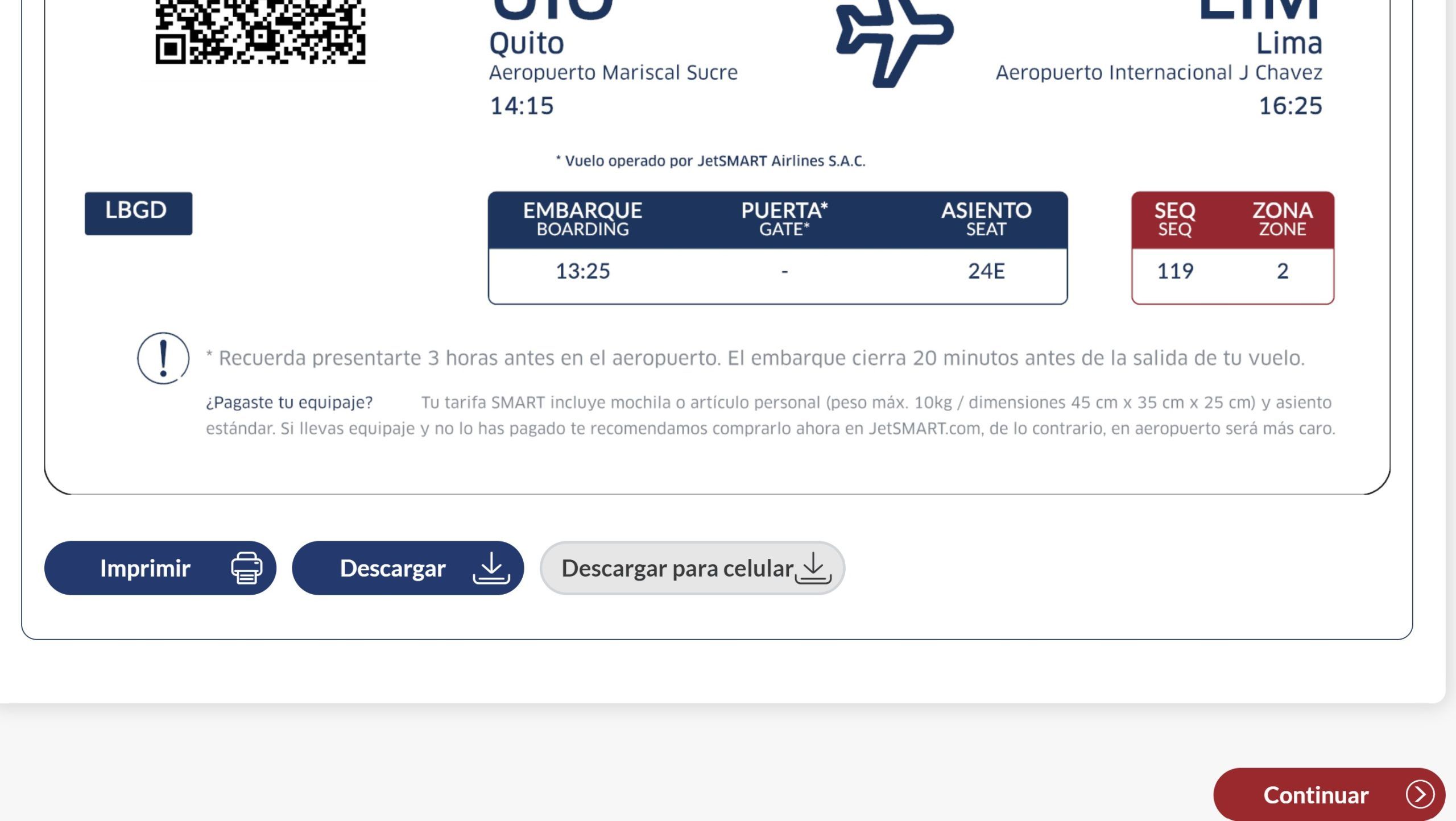 Après s'être présenté à l'aéroport 2 heures avant, moi dirigeí au comptoir d'enregistrement qui, dans le cas de JetSmart à Quito, est situé dans la zone C.