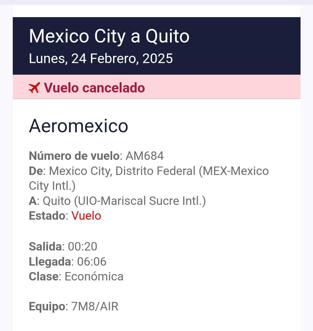 Icií Il est indiqué que le vol pour février 2025, date à laquelle déjà dûíont fonctionné normalement, Annulé sans optióNon à un report pour une date immédiate.