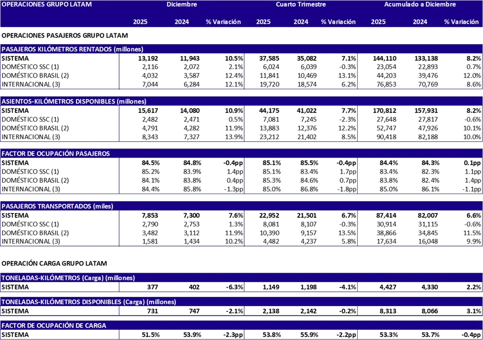 Pour sa part, le tráJe suis consolidé, mesuré en passagers-kilomètresócompteurs loués (RPK), augmenteró 10,5% en comparaisonón avec décembre 2024. Par conséquent, le facteur emploión consolidado del grupo LATAM alcanzó 84,5% durante el mes.
