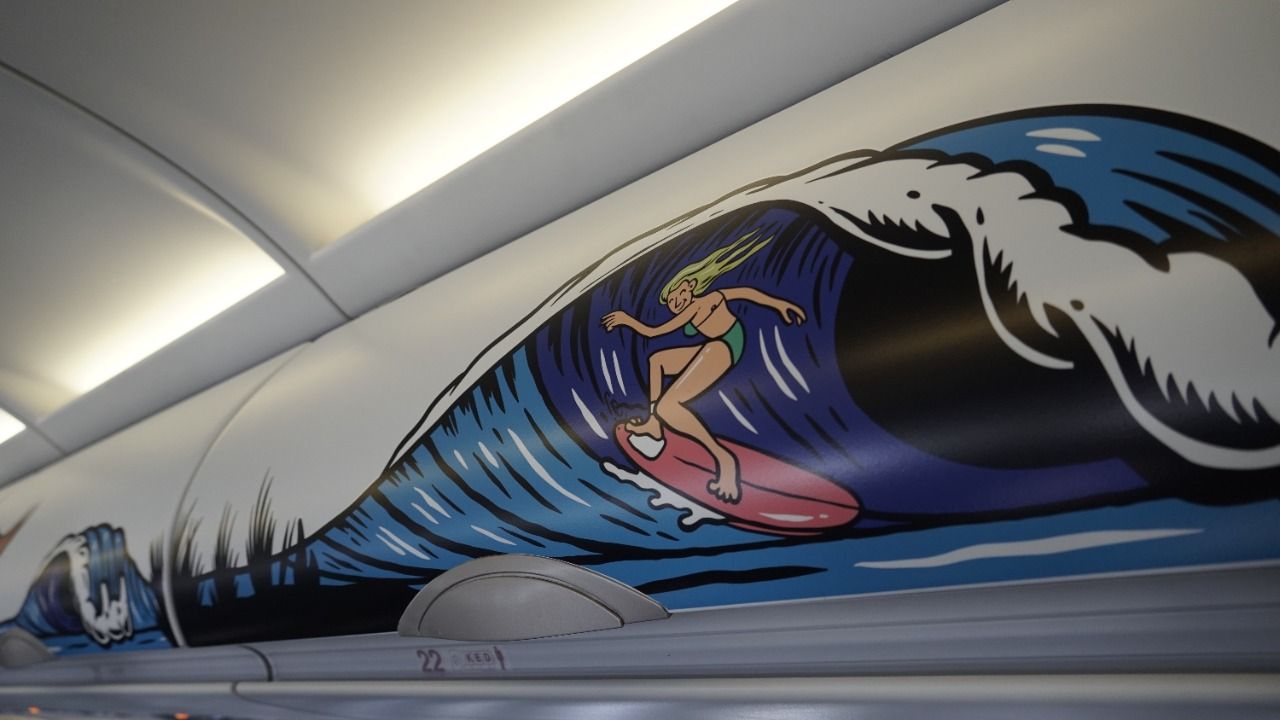 Oltretutto, L'arte salvadoregna può essere apprezzata dai passeggeri attraverso l'illustratore Armando Márquez, che ha catturato molti dei suoi progetti sui portabagagli e sui tavoli pieghevoli dell'aereo, inspirado en las playas salvadoreñas y en el valor diferenciador de las olas a través de una propuesta “arte del surf", che trasmette uno stile di vita della nostra costa salvadoregna.