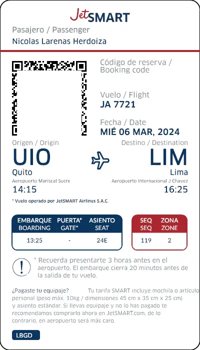 Dopo essersi presentato all'aeroporto 2 ore prima, mi dicoí al banco del check-in, che nel caso di JetSmart a Quito si trova nella Zona C.