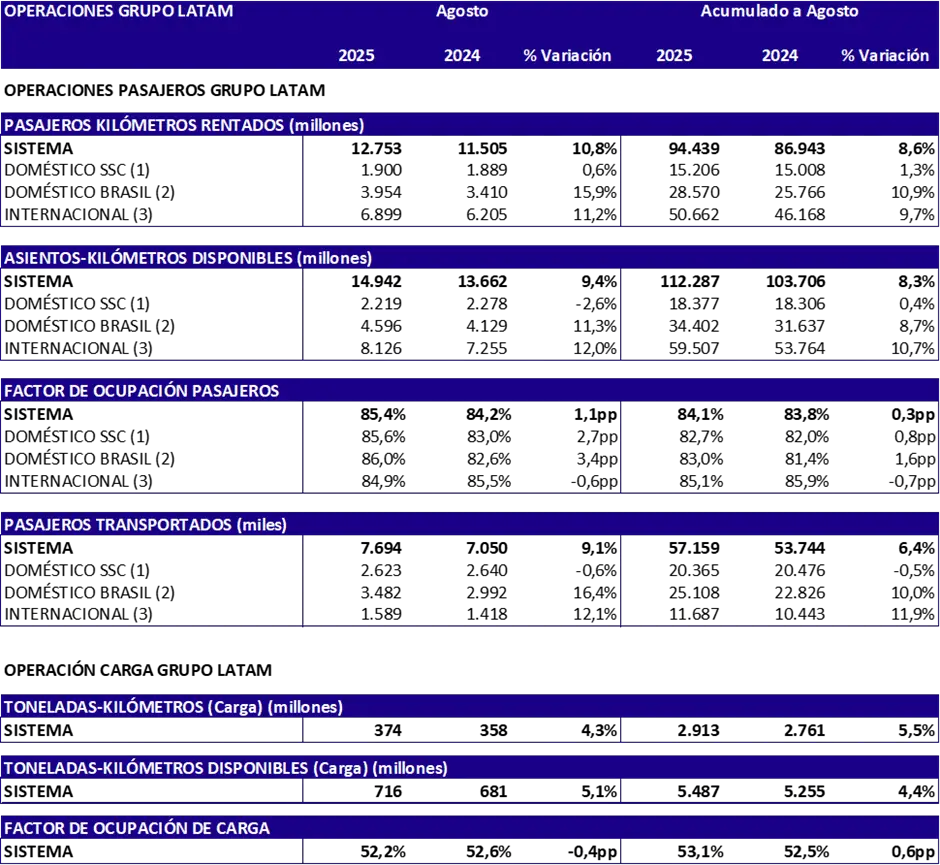 Durante il mese, il gruppo LATAM trasportoó un totale di 7,7 milioni di passeggeri, che rappresenta un aumento 9,1% in relazioneón con agosto de 2024. Il tráSono consolidato, misurato in passeggeri-chilometriómetri noleggiati (RPK), aumentoó un 10,8%. Di conseguenza, il fattore occupazioneón consolidato raggiuntoó un 85,4%, che rappresenta un aumento di 1,1 punti percentuali a confrontoón con lo stesso mese da añprecedente. Nell'accumulato da año, Il gruppo ha trasportato un totale di 57,1 milioni di passeggeri tra gennaio e agosto 2025.