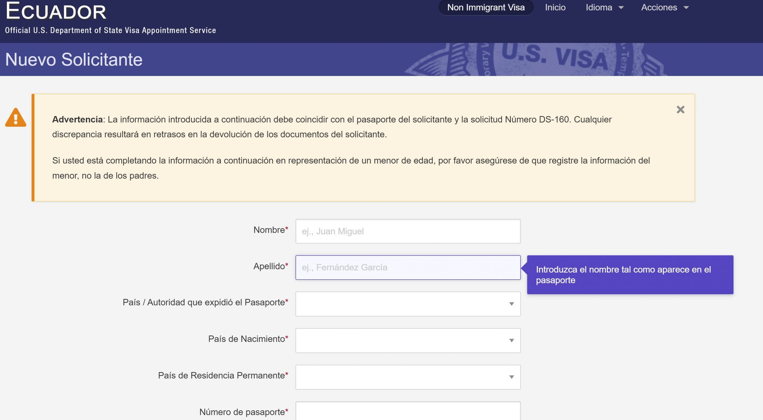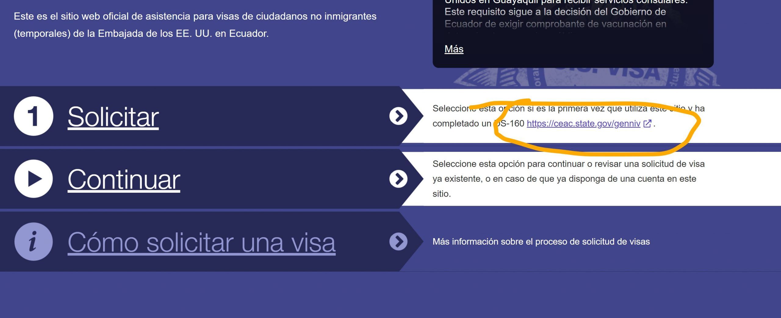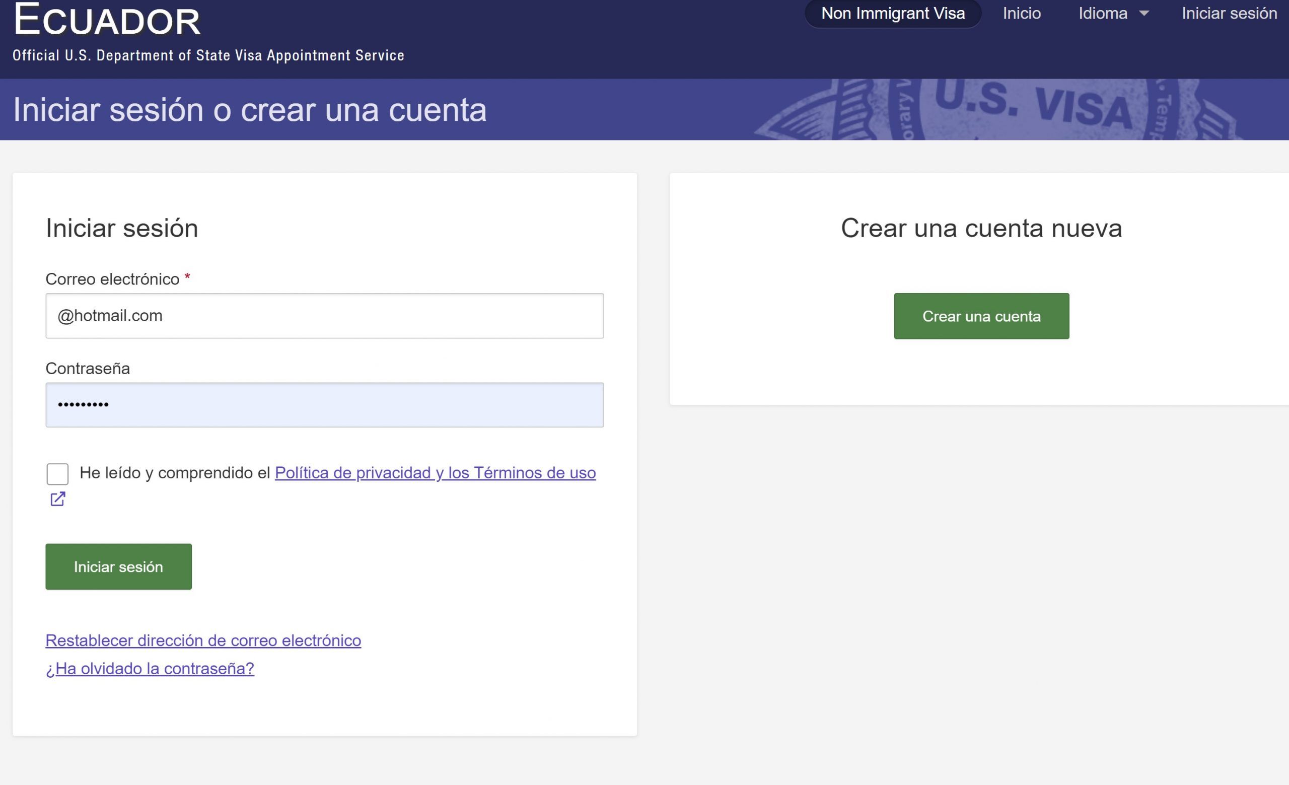 Digite o pásite oficial do Departamento de Estado: https://ais.usvisa-info.com/es-ec/niv