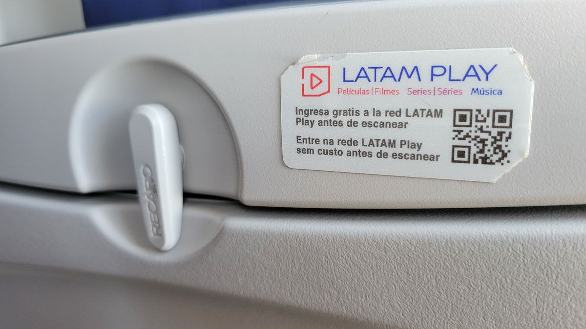 Agora vamos passar para o entretenimento. LATAM não oferece mais telas individuais ou superiores em sua frota A320 (IFE), então tudo se voltou para o sistema LATAM Play, que oferece uma ampla gama de música, filmes e séries. Para se conectar, basta adicionar a rede Wi-Fi local do avião e digitalizar o código QR encontrado em cada assento.