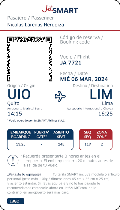 Depois de aparecer no aeroporto 2 horas antes, Fui ao balcão de check-in, que no caso do JetSmart em Quito fica na Zona C.