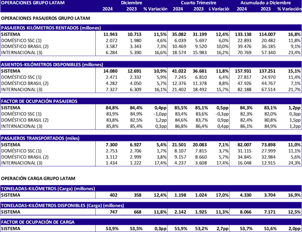 La siguiente tabla resume las principales estadísticas operacionales para el mes, trimestre y año acumulado a diciembre del grupo LATAM: