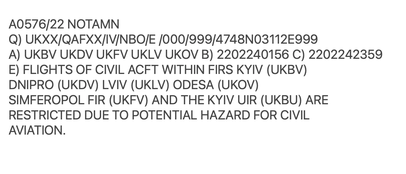 После начала боевых действий Россия на их территории, Se emitió el NOTAM que impide los vuelos del índole civiles en Ucrania, resguardando así la seguridad de pasajeros y tripulantes.