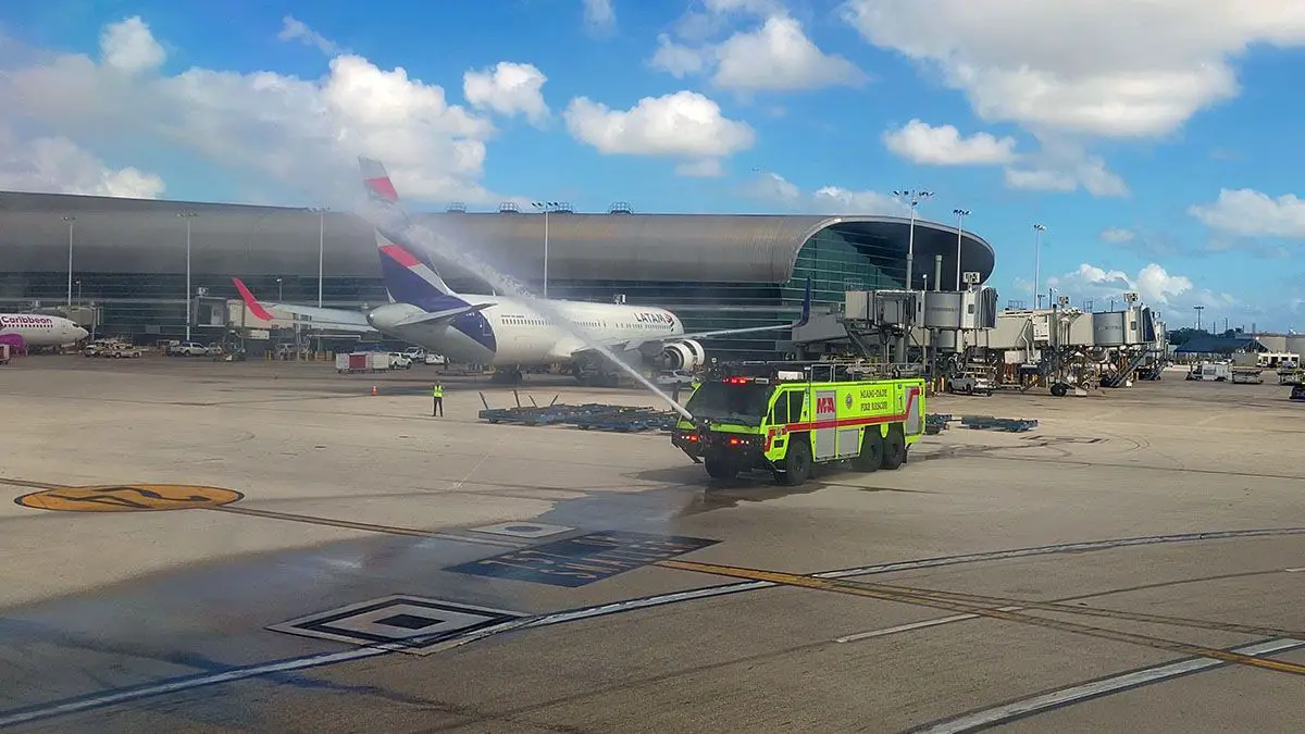 Рейс взлетелó в 8:46 Я и после 3 часы и 46 Протоколы мы приземляемся в маршруте в международном аэропорту Майами, отмечаяí Возвращение авиакомпанииíЭквадорская NEA в этом важном направлении. Как в капсулеíбыть меньше, Пожарные АэронаáЮтика из Майами приветствовала нас традиционными водная арка.