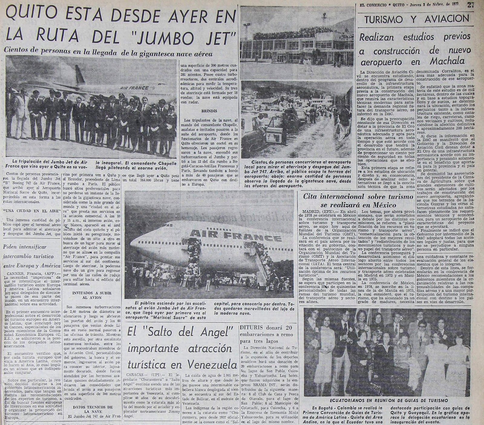 европейский Французские авиалинии, Это был первый аэрозольíнет, я пришел к указанной модели Эквадор, но анте нужныó размещениеón двойного слоя, а такжеáЛтика в старом аэропорту Кито так что он способен принимать этот самолет больших размеров. Прибыл первый рейсó в 2 ноябрь 1977, в 10 от меняñон, из Лимы примерно 60 пассажиры. после почти 2 часы, дедушкаóи ушелó соблюдать Боготский маршрутá – Каракас – Французские Антильские острова – Паритетíс.