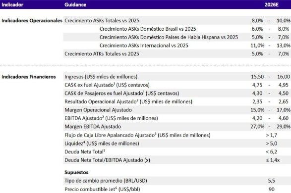 В то же время, Латинская Америка ожидает увеличения EBITDA (скорректированная прибыль до вычета процентов, налоги, амортизация, amortizaciones por sus siglas en inglés) достигнув диапазона от 4200 до 4600 миллионов долларов США за 2026, lo que representa un incremento con respecto al guidance de este año de US$4.000 millones a US$4.100 millones. В то же время, Группа прогнозирует скорректированную себестоимость единицы пассажирских перевозок без учета топлива между 4.3 а 4.5 центов.