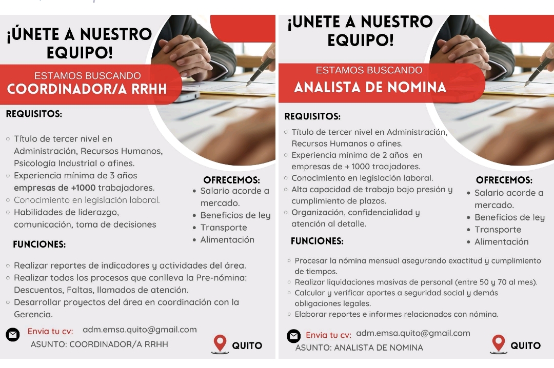 Coordinador y analistaPor Nicolás Larenas / abril 17, 2026 Full Time Quito Publicado hace 2 días Swissport Para solicitar este trabajo envía un correo electrónico con tus detalles a adm.emsa.quito@gmail.com Compartir: Compartir en WhatsApp (Se abre en una ventana nueva) WhatsApp Compartir en Telegram (Se abre en una ventana nueva) Telegram Compartir en Reddit (Se abre en una ventana nueva) Reddit Compartir en Tumblr (Se abre en una ventana nueva) Tumblr Comparte en Facebook (Se abre en una ventana nueva) Facebook Compartir en LinkedIn (Se abre en una ventana nueva) LinkedIn Haz clic en Pinterest (Se abre en una ventana nueva) Pinterest Compartir en X (Se abre en una ventana nueva) X